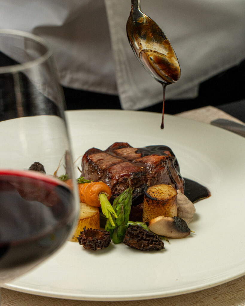 Fondo: Centro de filete de res con reducción de vino tinto y hongos morcella, acompañado de Lingote de papas confitadas en mantequilla de campo, espárragos y zanahorias baby rostizadas.