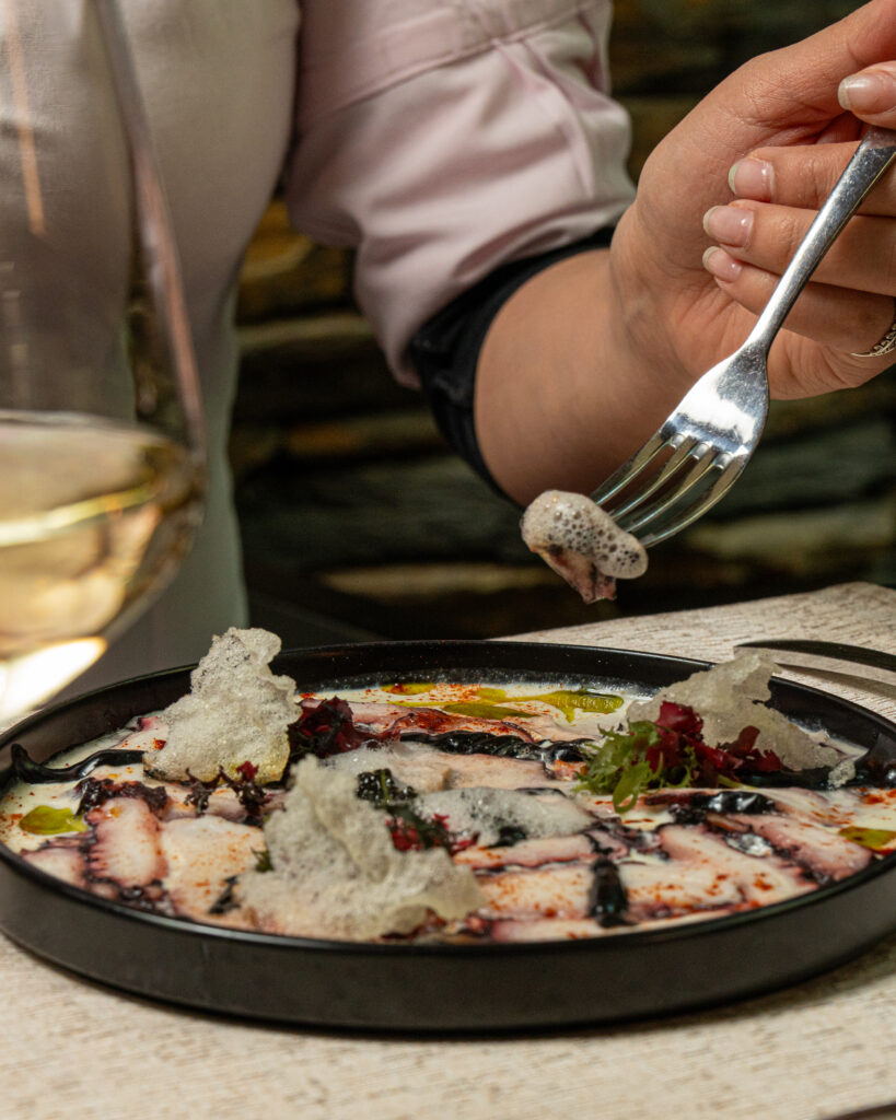 Entrada: Carpaccio de pulpo, leche de tigre con parmesano, aceite de cilantro, crocante de tapioca, emulsión de coral y aire marino.