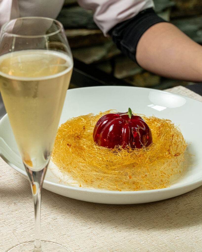 Postre: Manzana rellena de mousse de chocolate de Madagascar, Insert de frutos del bosque (zarzaparrilla, frambuesa y cerezas).