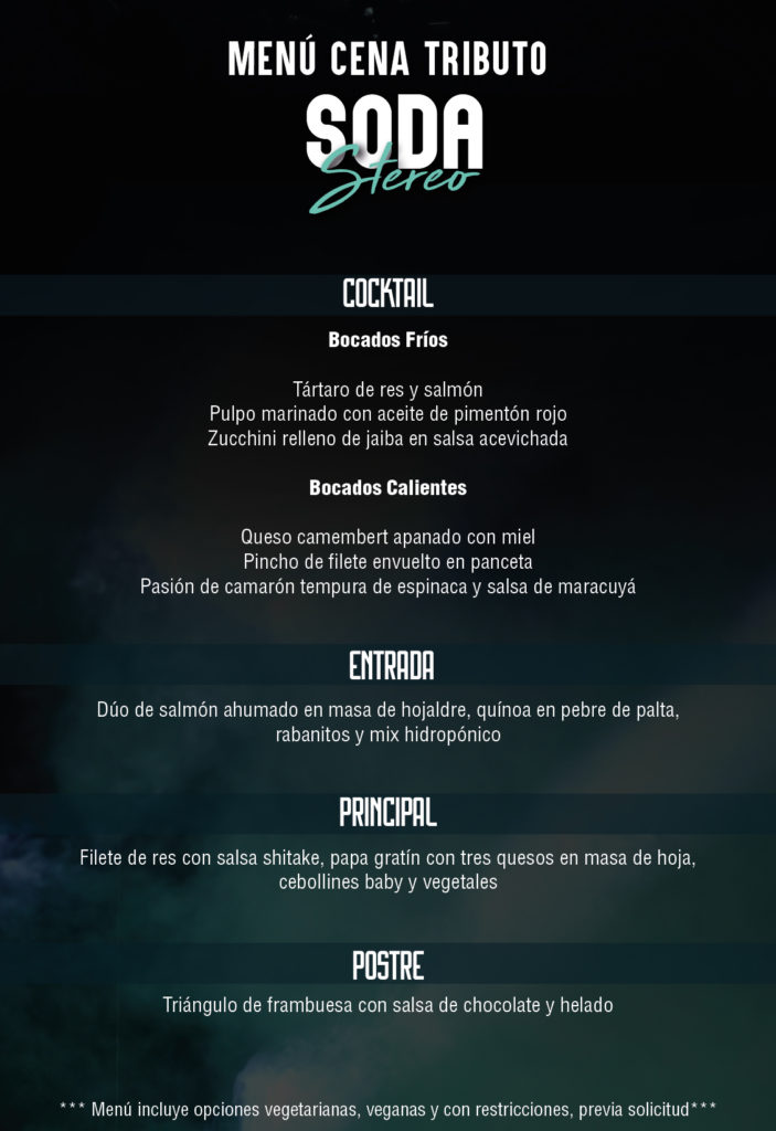 Cena* de tres tiempos de la mano de su chef Ejecutivo Sergio Ahumada acompañada por selección de vinos de Viña Errázuriz y mientras todo esto va avanzando, las reconocidas canciones de Soda Stereo animarán la noche automáticamente, ¡baile y canto 100% permitido!